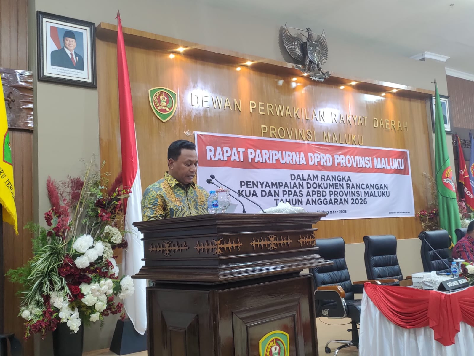 Rapat Paripurna DPRD Provinsi Maluku dalam rangka penyampaian Rancangan Kebijakan Umum Anggaran serta Prioritas dan Plafon Anggaran Sementara (KUA-PPAS) Tahun Anggaran 2026 dihadiri oleh Ketua, Wakil Ketua, dan seluruh Anggota DPRD Provinsi Maluku, Forum Koordinasi Pimpinan Daerah (Forkopimda) Provinsi Maluku atau yang mewakili, para Staf Ahli dan Asisten Sekretaris Daerah (Sekda) beserta pimpinan Organisasi Perangkat Daerah (OPD) di lingkungan Pemerintah Provinsi Maluku, serta rekan-rekan media cetak dan elektronik. (CM/Ml/**)
