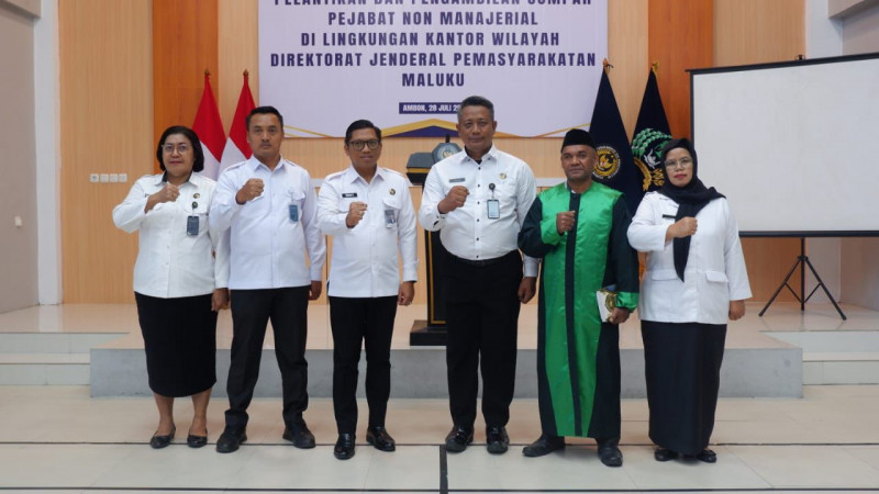 Ambon, CM- Dalam memastikan bahwa Organisasi dapat memenuhi kebutuhan dan tantangan yang ada sesuai dengan peraturan yang berlaku, Kantor Wilayah (Kanwil) Direktorat Jenderal Pemasyarakatan (Ditjenpas) Maluku menggelar pelantikan dan pengambilan sumpah jabatan fungsional non manajerial Jabatan Fungsional Tertentu (JFT) Pembina Keamanan Pemasyarakatan, Senin (28/725).