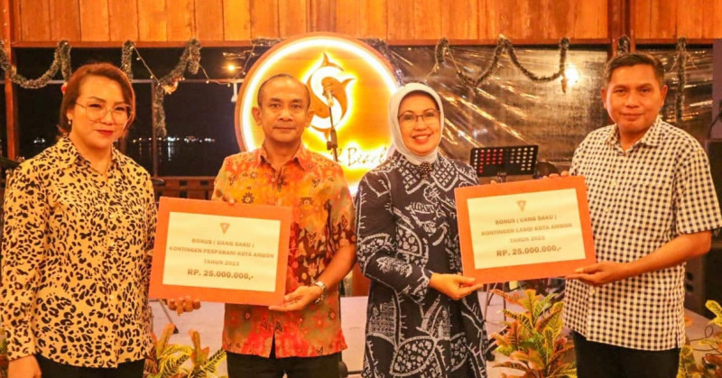 Penyerahan bonus yang dirangkai dengan jamuan makan malam ini digelar Jumat (5/1/24) di Sari Gurih Beach Lateri serta turut dihadiri Kepala Kantor Kemenag Kota Ambon, Wakil Uskup Diosis Amboina, Ketua LP3K Maluku dan Kota Ambon, Ketua DPD Lasqi Maluku dan Kota Ambon, Ketua Baznas, PJ. Ketua TP -PKK serta para pimpinan OPD.