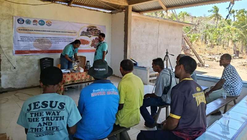Diketahui, tim yang terdiri dari 3 (tiga) orang dosen dan 2 (dua) mahasiswa melaksanakan kegiatan awal dengan melakukan sosialisasi bagi mitra masyarakat kepada 10 orang masyarakat kelompok Industri Rumah Tangga (RT) di Desa Oirata, Maluku Barat Daya, tentang penerapan teknologi untuk peningkatan produksi gula merah dari nira koli (Borassus flabellifer L.).