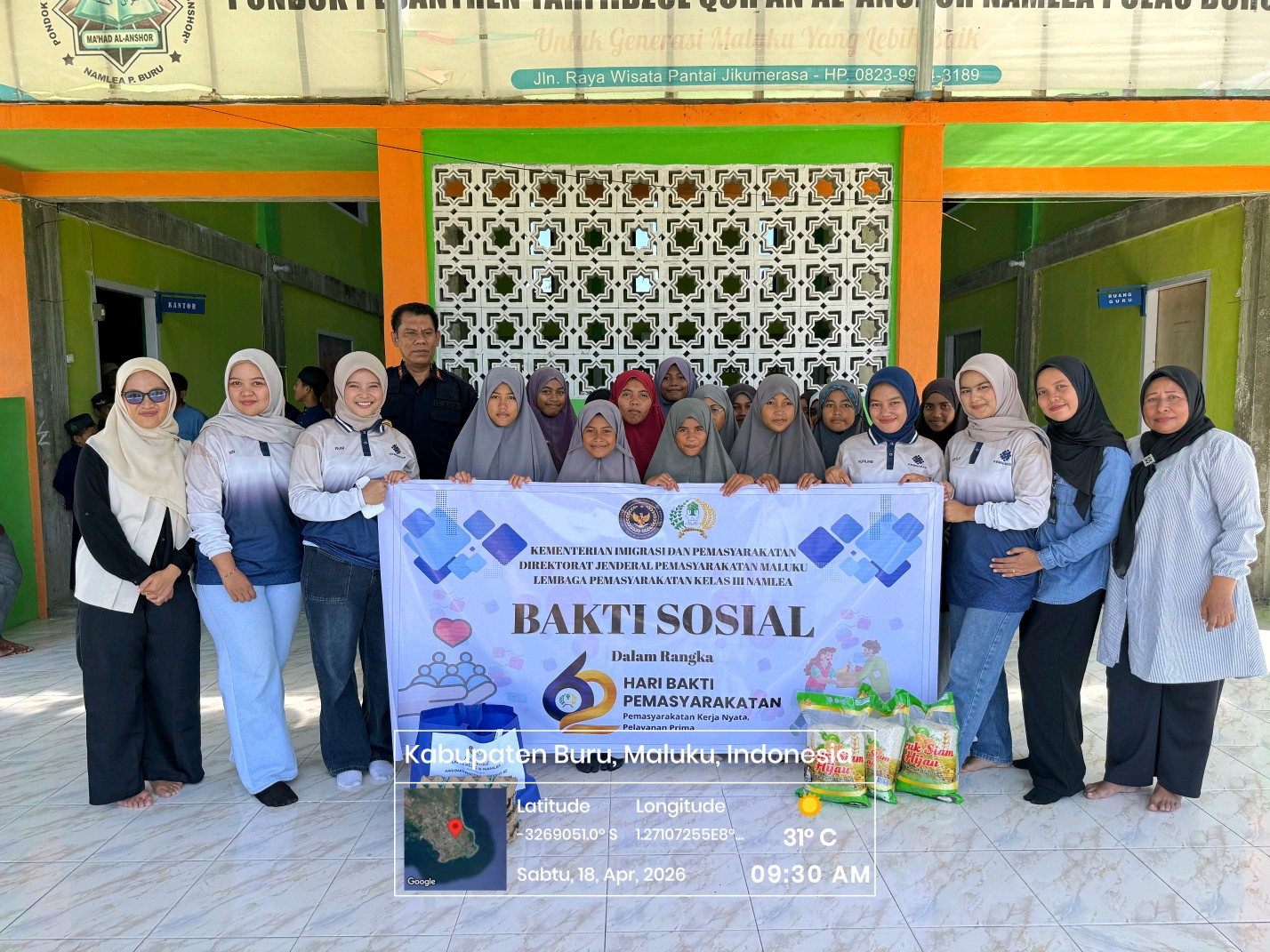 Namlea,CM- Lembaga Pemasyarakatan (Lapas) Kelas III Namlea kembali menunjukkan kepeduliannya kepada masyarakat melalui aksi sosial penyaluran bantuan sosial (bansos), Sabtu (18/04/26). Kegiatan ini menjadi bagian dari rangkaian peringatan Hari Bakti Pemasyarakatan (HBP) ke-62. Sebanyak lima paket bansos disalurkan kepada masyarakat sekitar serta santri Pondok Pesantren Tahfidzul Qur’an Al-Anshor di Desa Jikumerasa. Penyerahan bantuan dilakukan langsung oleh Kepala Lapas Namlea, Muhammad M. Marasabessy, bersama jajaran Kepala Subseksi dan pegawai.